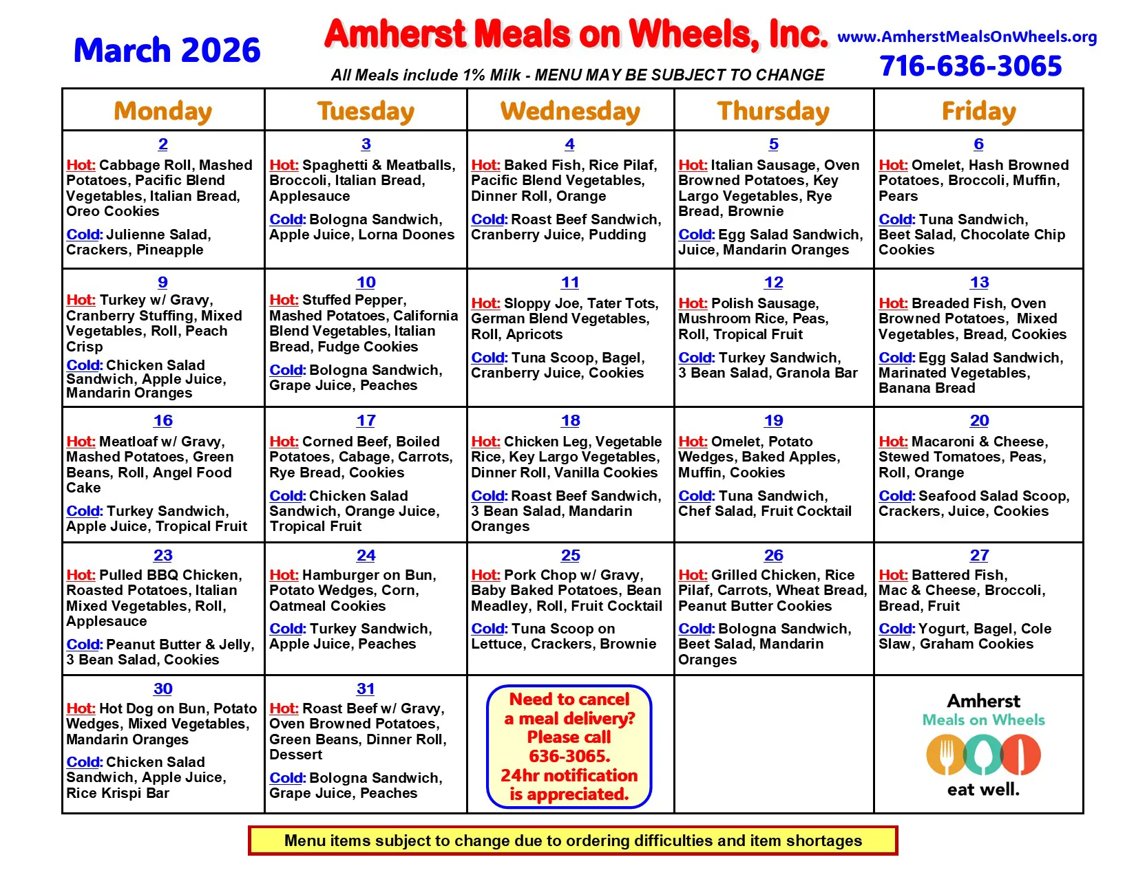 Menu March 2026 All meals include 1% milk. Menu may be subject to change. Nutrition and Dietary Standards Questions or comments? We look forward to hearing from you. Address: 370 Audubon Parkway, Amherst NY 14228 Name Email Address Message 14 + 13 = Send Amherst Meals on Wheels, Inc. is funded in part by the Erie County Department of Senior Services Amherst Meals on Wheels, Inc. is recognized by the New York State Office for the Aging